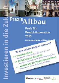 Mit der Ausstellung „Produktinnovation 2013“ werden die Exponate innerhalb der BAU 2013 in der Halle B0 vom 14. bis 19. Jan. 2013 täglich von 9:30 Uhr bis 18:30 Uhr zu besichtigen sein. Es werden Führungen angeboten, bei denen die Produktideen erläutert werden.